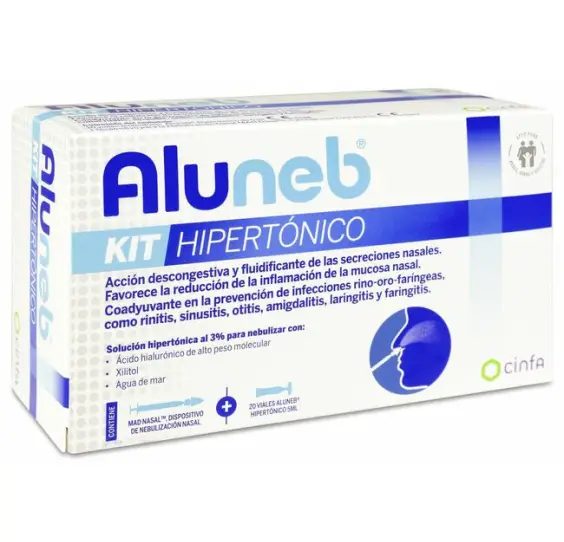 Aluneb Kit Hipertónico es una solución salina hipertónica al 3% que actúa como coadyuvante en el tratamiento de la amigdalitis, laringitis, faringitis, rinitis, sinusitis y otitis, ya que libera la nariz del moco de forma eficaz y favorece la eliminación de secreciones nasales excesivas.