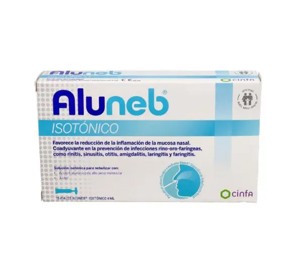 Aluneb Solución Isotónica de 4 ml para aliviar la inflamación de las mucosas de la nariz en resfriados comunes y procesos de sinusitis, otitis o rinitis. El ácido hialurónico en estado nebulizado humecta y ayuda a la salida del moco y los agentes alérgenos de las vías respiratorias, creando una barrera protectora.